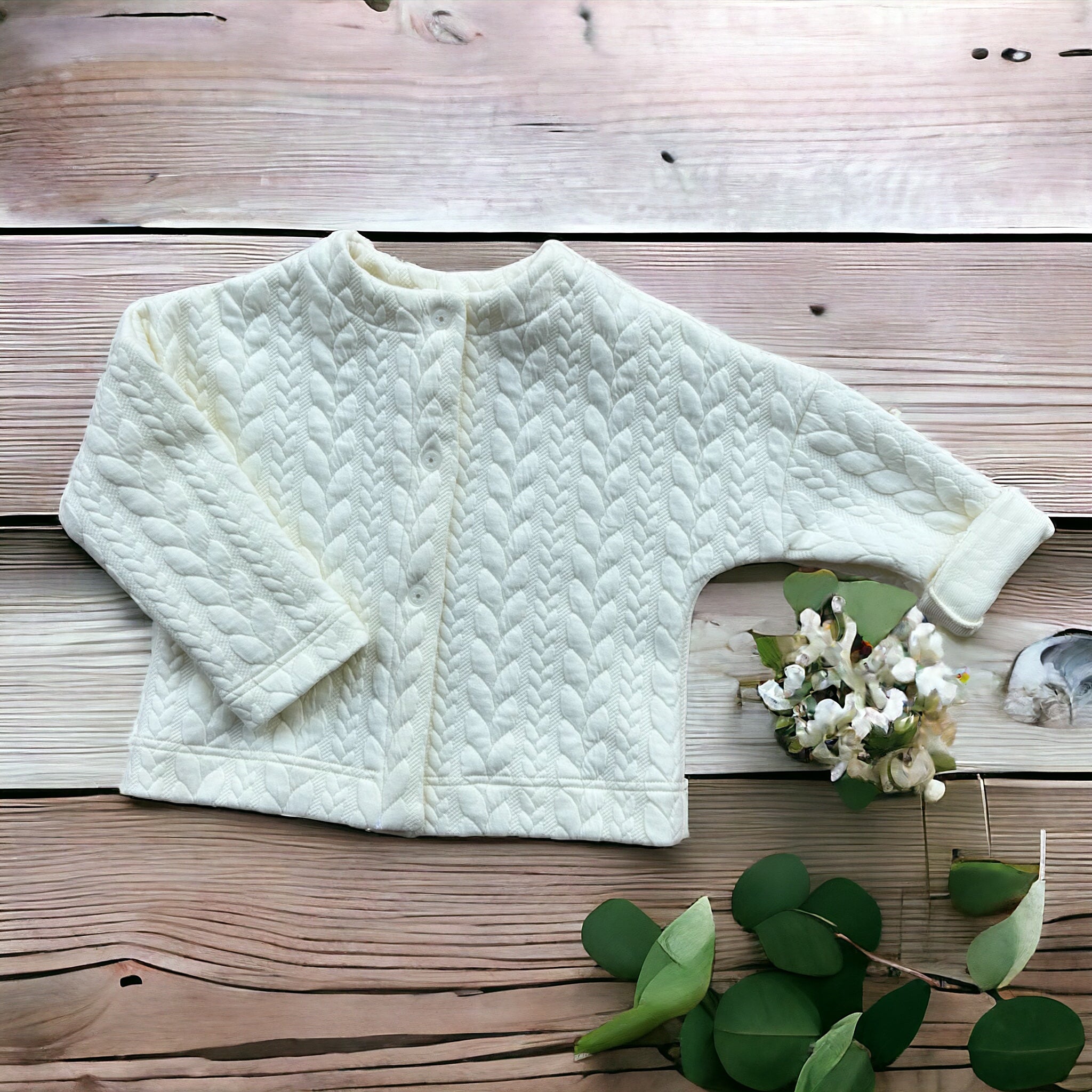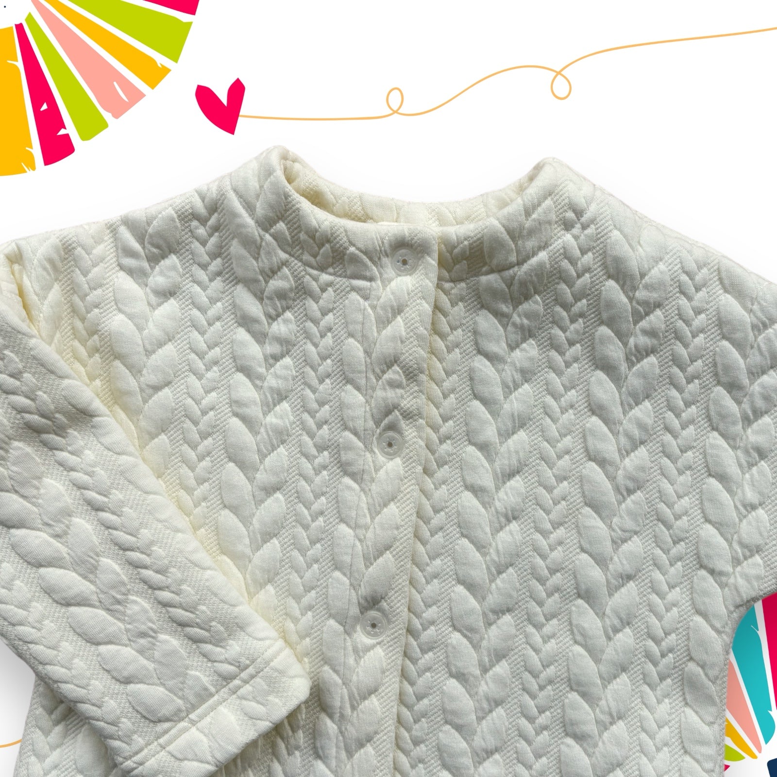 Questo Cardigan dal taglio Chanel in tessuto felpato con motivo treccia in rilievo dal color panna è perfetto per essere indossato in tantissime occasioni, Dalla più sportiva alla più elegante. Il taglio è leggermente corto per essere indossato anche con dei vestitini più eleganti. L'abbottonatura con i bottoncini automatici a pressione permette anche alla bimba di indossarlo ed allacciarlo con facilità.