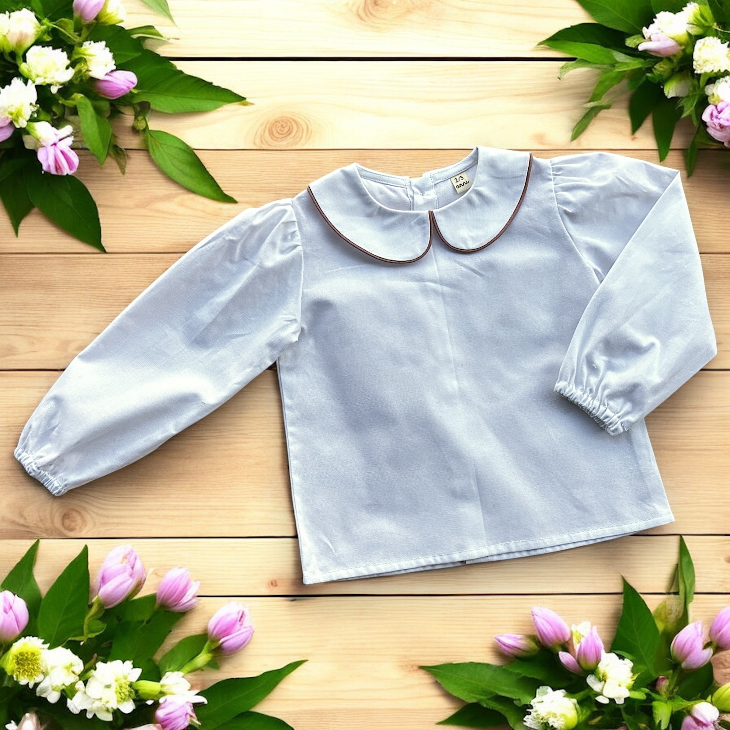 Camicia bianca con colletto alla bebè estiva con profilo malva