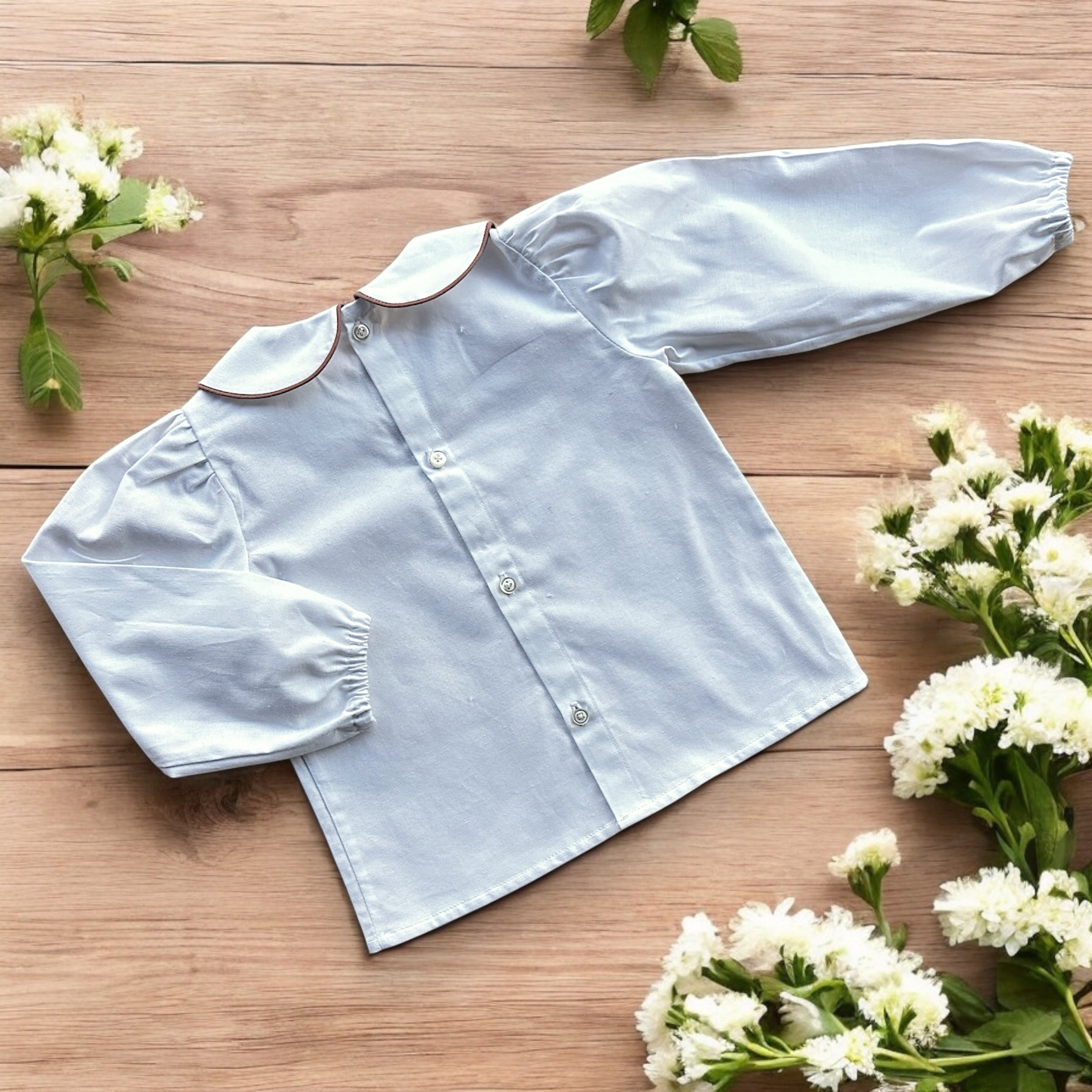Camicia bianca con colletto alla bebè con profilo salvia