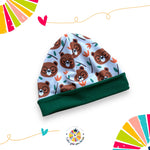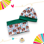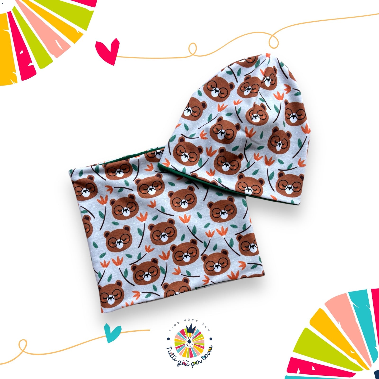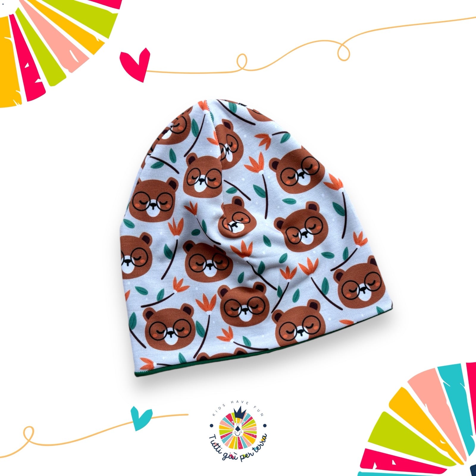 Cappellino double-Face in caldo cotone con fantasia orsetti con gli occhiali disegnata esclusivamente per Tutti Giù per terra, adatto per le mezze stagioni e gli inverni meno rigidi, abbinalo al collo della stessa fantasia per riscaldare il tuo piccolino e portare allegria nelle fredde giornate invernali.
