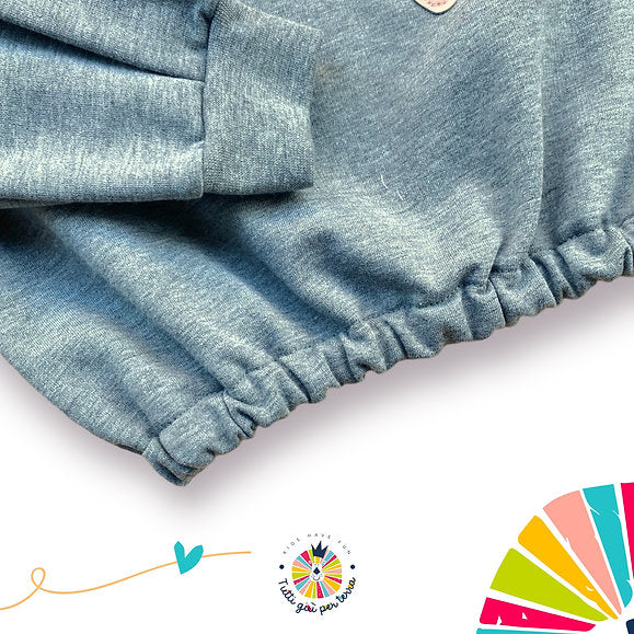 Il tessuto utilizzato è felpa 100% cotone certificata Oeko-Tex. Lavare a massimo 40 gradi. Non utilizzare l'asciugatrice e stirare a basse temperature.