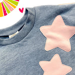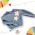 Felpa Crop con morbido elastico in vita e maniche con piegoni, dettaglio stelline in ecopelle applicate. Perfetta da abbinare agli shorts in ecopelle!
