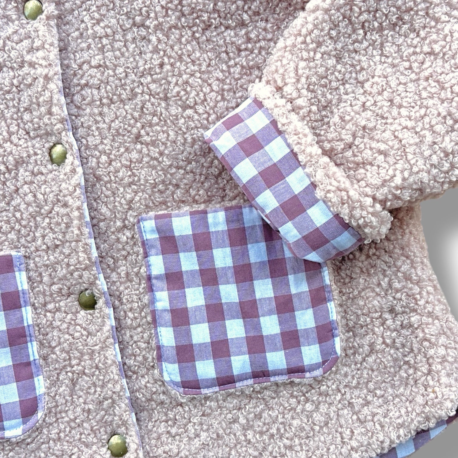 Giacchina in tessuto boucle/teddy rosa antico foderata in pipeline di cotone a quadrettoni rosa malva.