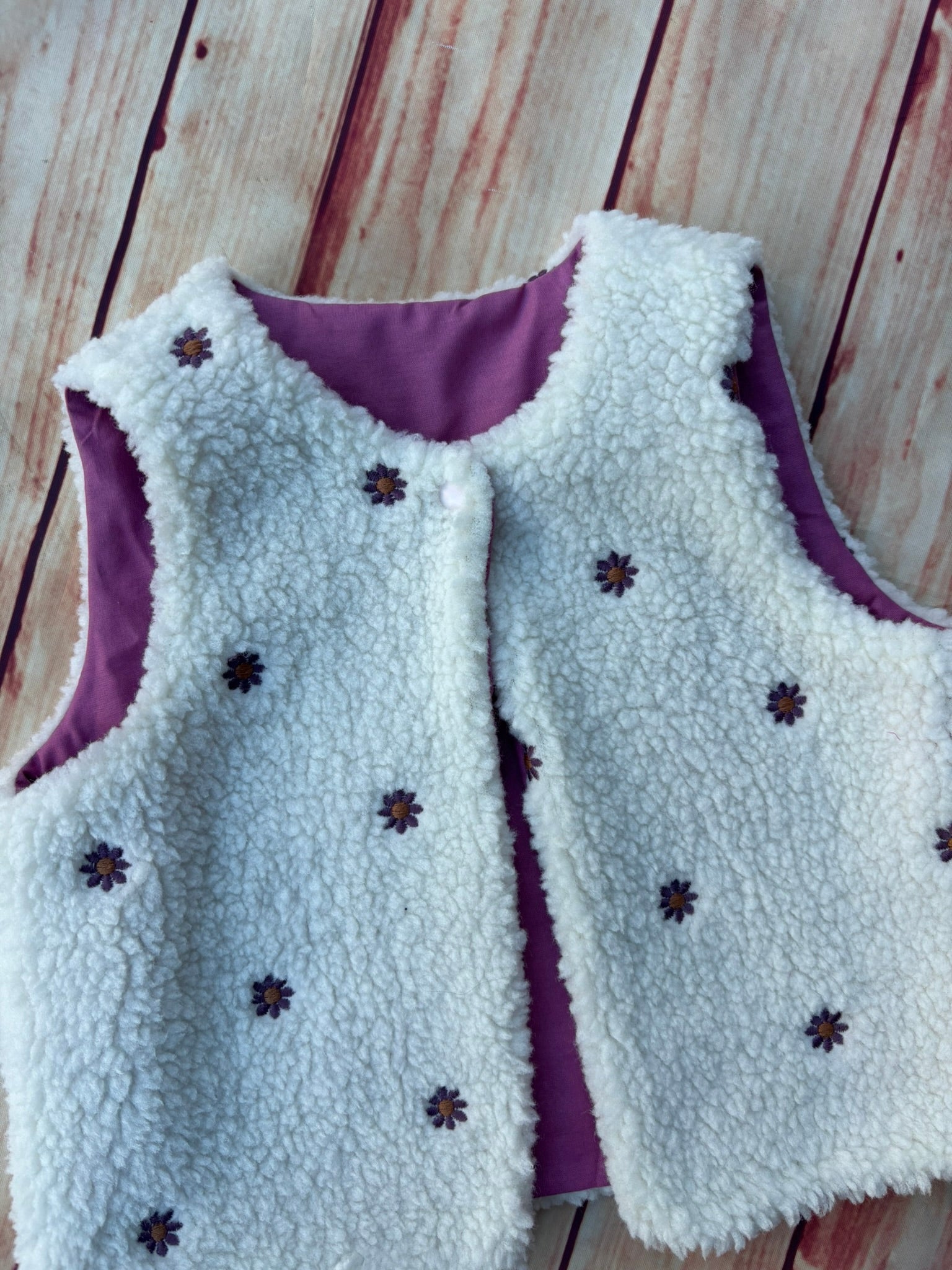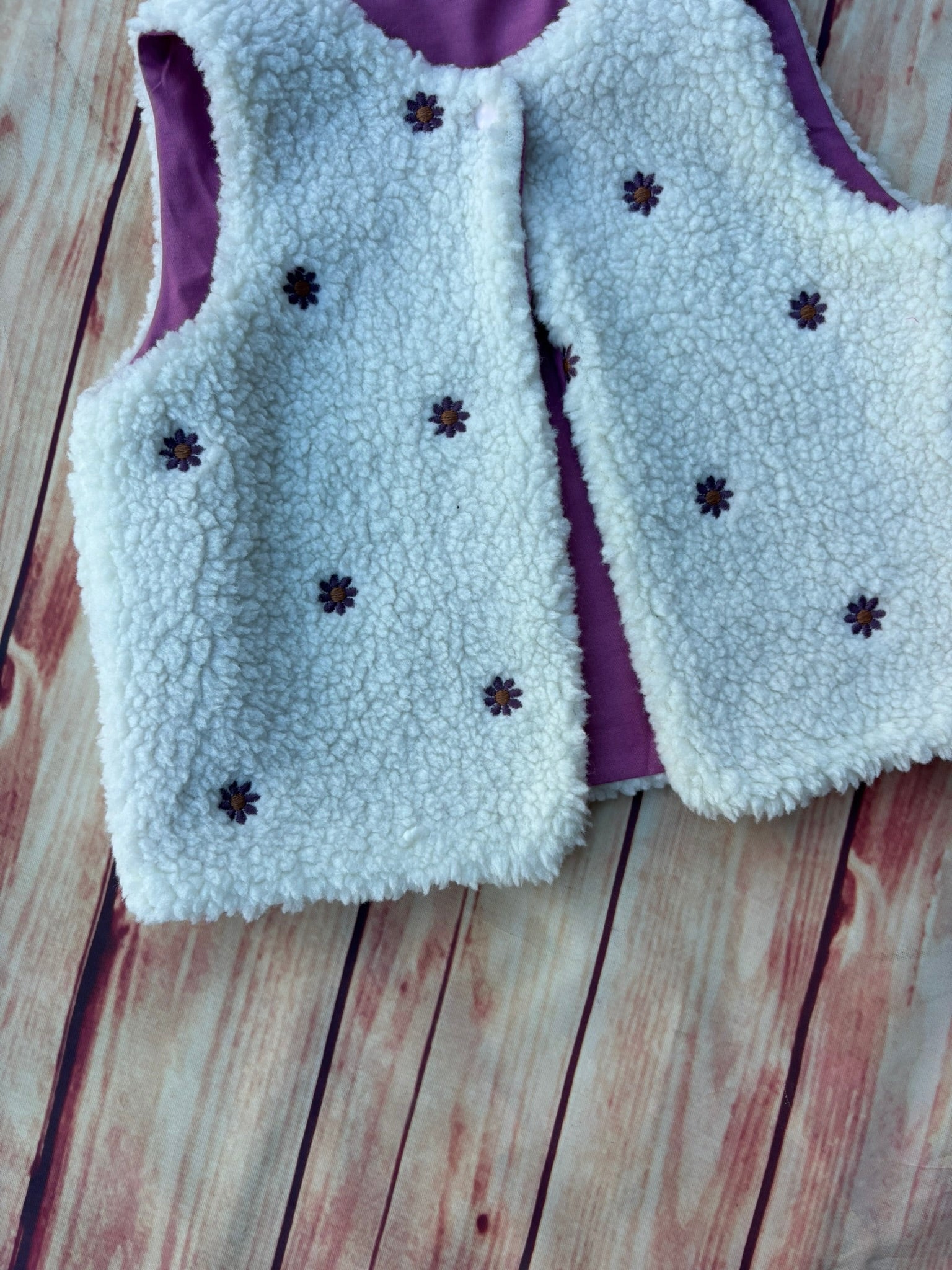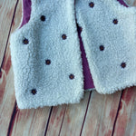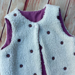 Gilet in tessuto Teddy bianco con fiorellini ricamati, interamente foderato in 100% cotone malva e bottoncino automatico sullo scollo